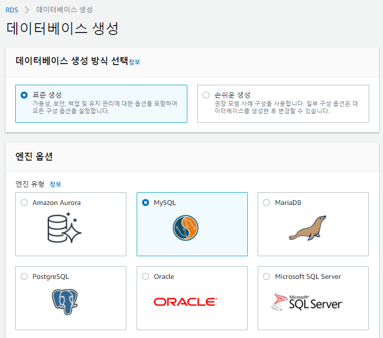 표준 생성, MySQL 선택