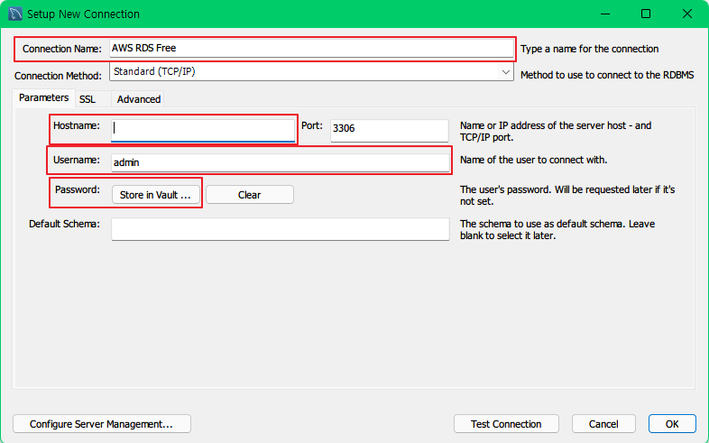 Hostname에는 RDS 엔드포인트를 넣으면 되고