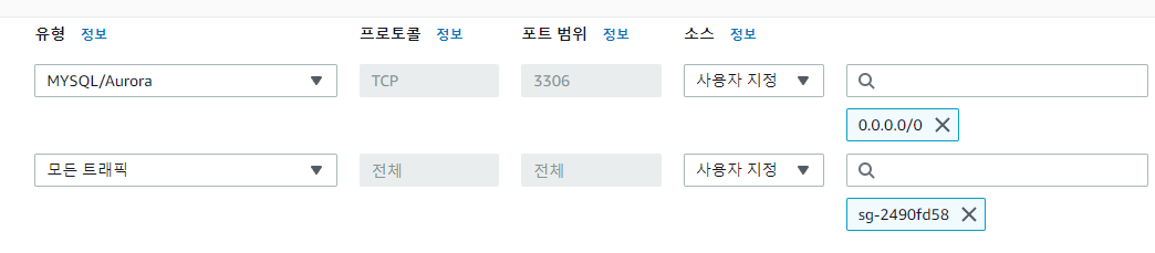 인바운드 규칙 편집에 들어와서 MYSQL/Aurora 추가