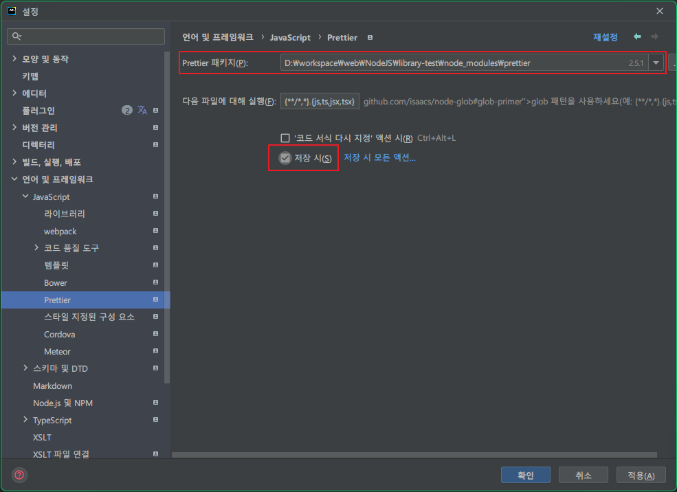 Prettier 패키지에는 위에서 글로벌로 설치한 prettier를 넣으면 되고