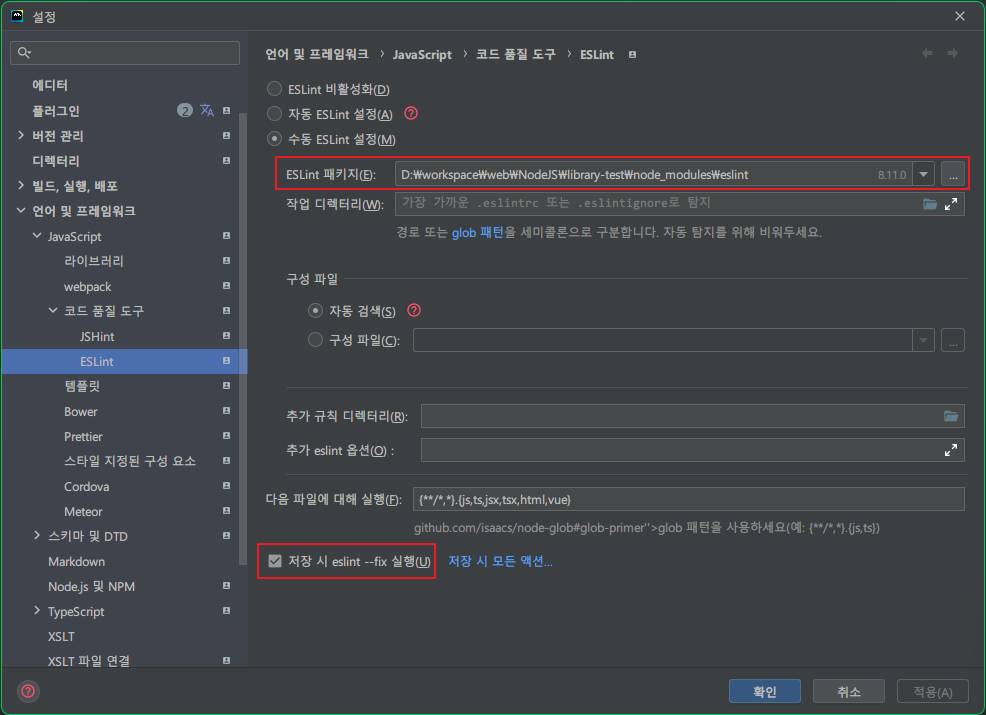 그리고 WebStorm 설정에 들어와서 'ESLint 패키지'와 '저장 시 eslint --fix 실행'를 체크해줍니다.