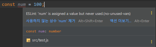 임의의 변수 하나를 생성했는데 바로 ESLint에서 에러를 발생시켰습니다.