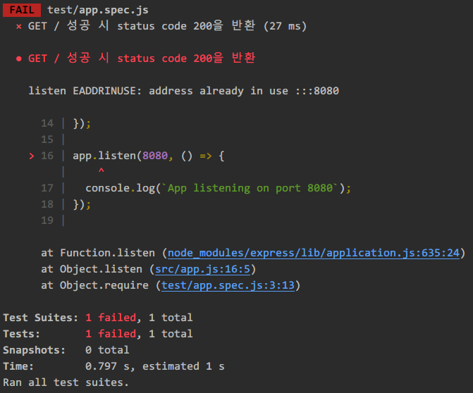 app.js에서 app.listen을 다른 파일로 옮김으로써 해결할 수 있었다.