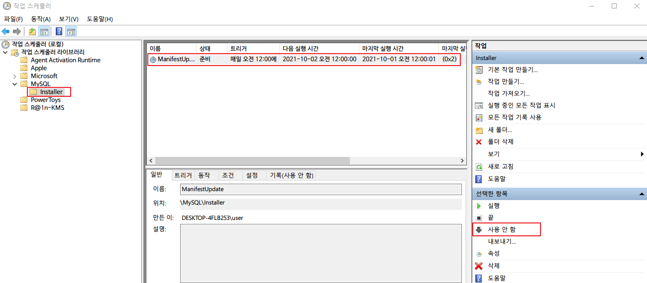 작업 스케줄러 라이브러리 > MySQL > Installer를 누르고 ManifestUpdate 클릭 > '사용 안 함' 클릭
